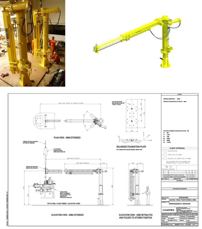 A customer in Brazil required a system to maneuver heavy (6,000kg) casing tongs on the drillfloor of their drillships. Hampco offered a concept of hydraulic custom push-pull and slew arms whereby the vertical load was supported by adjustable hangoff wires mounted under the derrick crown blocks. Time was very limited and we had to design, manufacture and install 4 units in a maximum of 12 weeks including the drillfloor foundations with ABS approval. Owing to the deadline, all hardware was sourced and manufacturing carried out in Brazil. This required an intense level of cooperation between Hampco's project team and all suppliers but the project was successfully completed several days ahead of schedule.